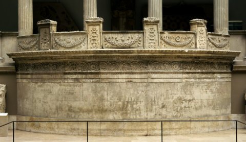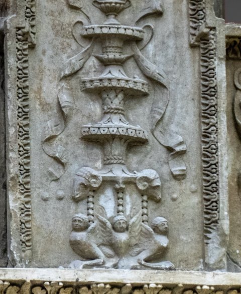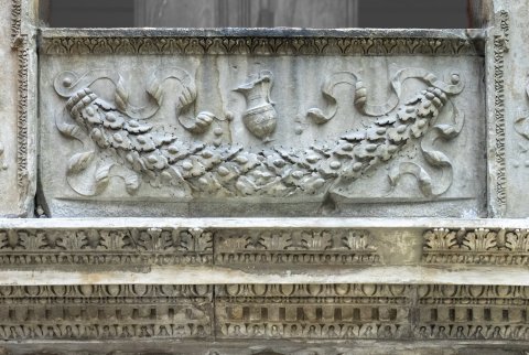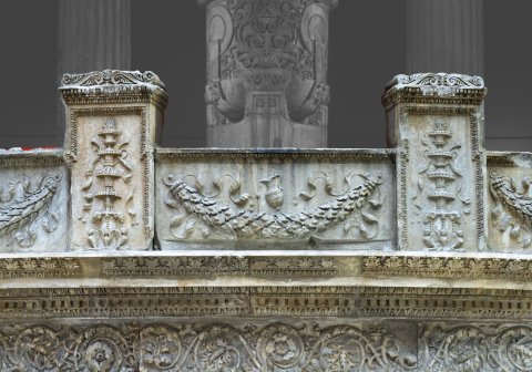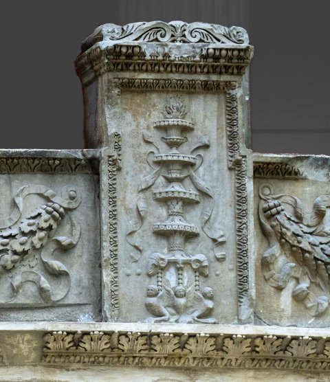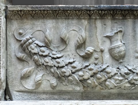 - Zylindrische Wand mit Quadermauer, Architrav mit Fascien und Akanthusranken-Fries, darüber Gesims und Brüstung aus Altären und Schrankenplatten als Einfassung des Tumulus. Die Altäre mit Kandelaberreliefs, oben pulvini mit S-Haken; auf den Schrankenplatten Lorbeer- und Eichenlaubgirlanden mit Tänien, in den Girlandenbögen Gefäße (abwechseld Kanne und Patera).
