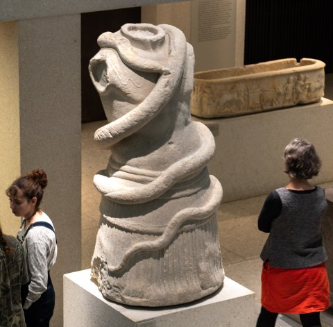 - Überlebensgroßer männlicher Torso im Panzer (?), umwunden von einer Schlange (Aion ?)