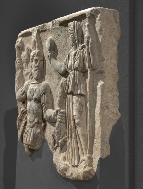 - Mythische Figuren: Jupiter Dolichenus im Panzer, mit hohem Kopfaufsatz, Doppelaxt in der rechten und Blitzbündel in der linken Hand. Links neben dem Kopf Adler mit Kranz im Schnabel. Dem Gott gegenüber, etwas kleiner, Juno mit Diadem und Schleier, auf einem Hirsch stehend, Spiegel in der rechten, Szepter in der linken Hand.