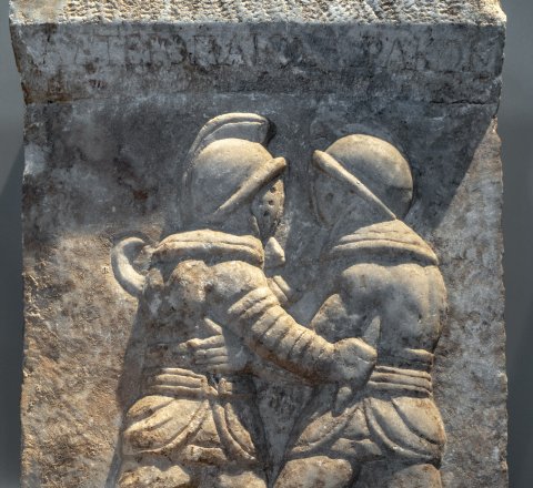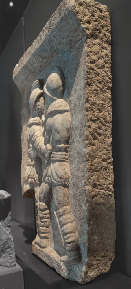 - Reliefplatte von einer Brüstung, oben u. unten vorspringender Rand. Kampfszene mit zwei schwer bewaffneten Gladiatoren (Hoplomachus).