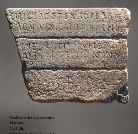 - Hic iacet Exsoperanti/a(!) qu(a)e vixit ann(os) VIIII men(ses) IIIII / dies XV titulum posuit(!) / Albinus et Tirintina / patre[s] in pace