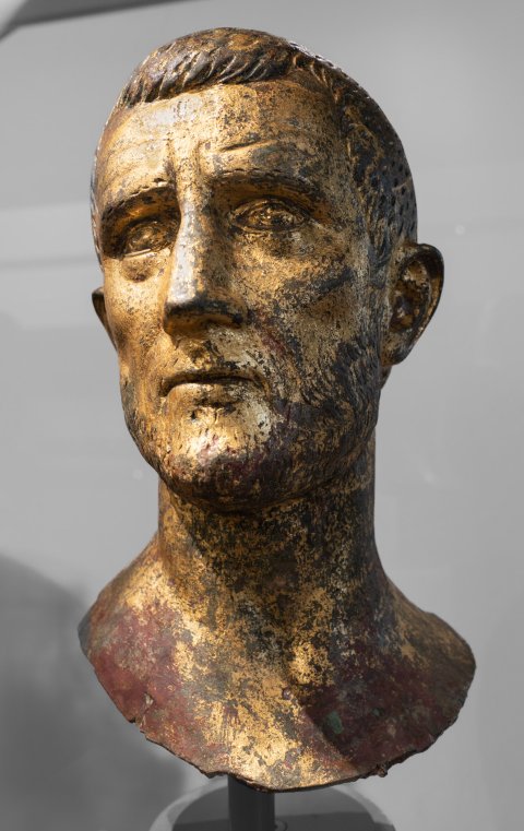 - Historische Person: Porträt eines Mannes (Kaiser Aurelian ?) mit kurz gesträhntem Haar und Bart. Kopf zum Einsetzen.