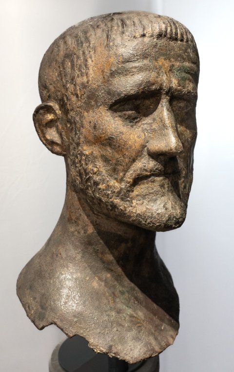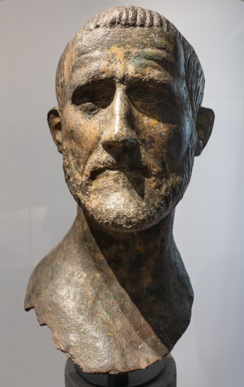 - Historische Person: Porträt eines Mannes (Kaiser Probus ?) mit kurz gesträhntem Haar und Bart. Kopf zum Einsetzen.