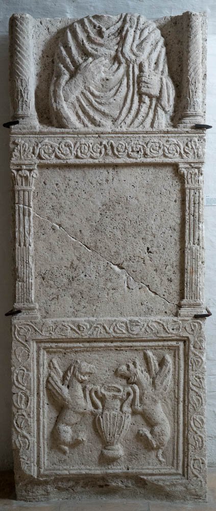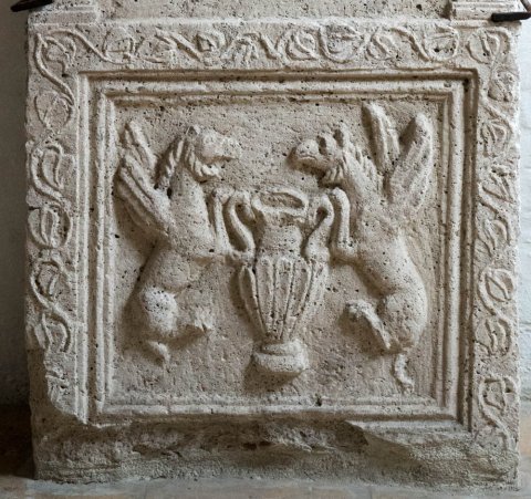 Im Sockelbild Krater zwischen Greifen. Auf dem Rahmen Efeuranke. - Kommentar