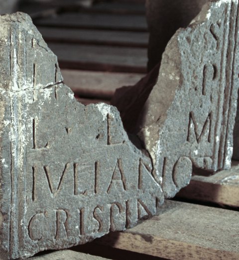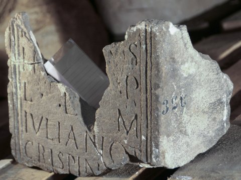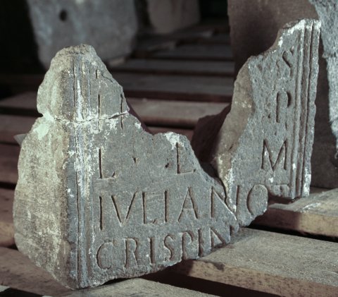 - ---]M / [---]D / [---]V / I[---]S / in suo p(osuit) / l(ibens) l(aetus) m(erito) / Iuliano et / Crispin[o co(n)s(ulibus)]
