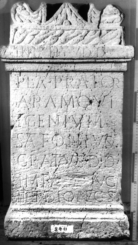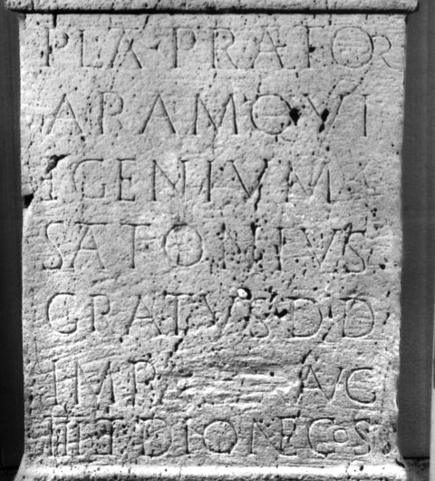 - In h(onorem) d(omus) d(ivinae) // plat(eae) praetor(iae) / aram qui / et Genium / Sattonius / Gratus d(onum) d(edit) / Imp(eratore) [[Alex(andro)]] Aug(usto) / III et Dione co(n)s(ulibus)