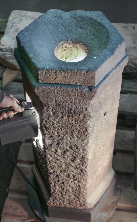 - aus Fragmenten zusammengesetzt, in der Oberseite runde, in der Rückseite viereckige Öffnung, innen ausgehöhlt