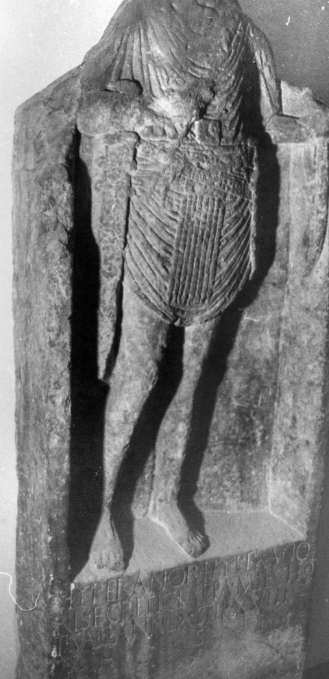 - Über der rahmenlosen Inschrift Reliefnische mit stehendem Mann (Soldat) mit Streifenschurz, gekreuztem Gürtel mit Metallbeschlägen, an der rechten Hüfte Schwert in verzierter Schwertscheide.