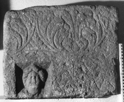 - Oben Akanthusornament, darunter rechts Inschrift, links Rest einer eckigen Nische mit Kopf und Schultern einer Frau.