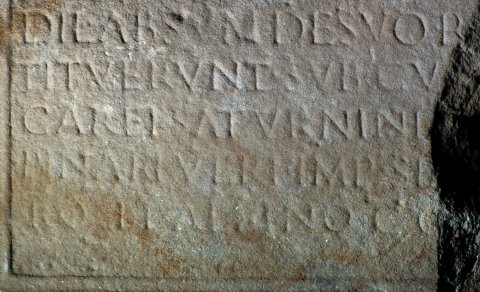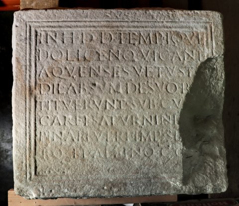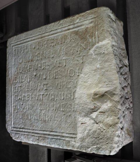- In h(onorem) d(omus) d(ivinae) temp(lum) Iovi / Dolic(h)eno vicani / Aquenses vetust[a(te)] / dilabsum(!) de suo r[es]/tituerunt sub cu[ra] / Carei Saturnini [et] / Pinari Veri Imp(eratore) Se[ve]ro / et Albino co(n)[s(ulibus)]