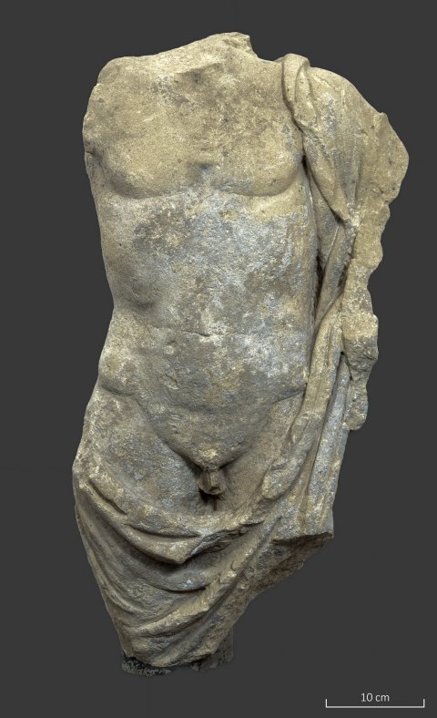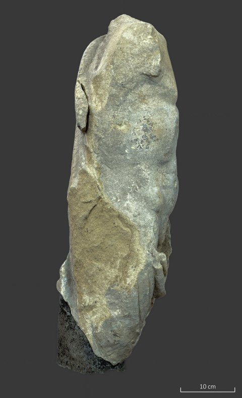 - Torso mit Teilen des linken Arms u. der Oberschenkel, bestoßen, linke Seite u. tlw. Rückseite abgeschlagen; Reste von weißlichem Überzug