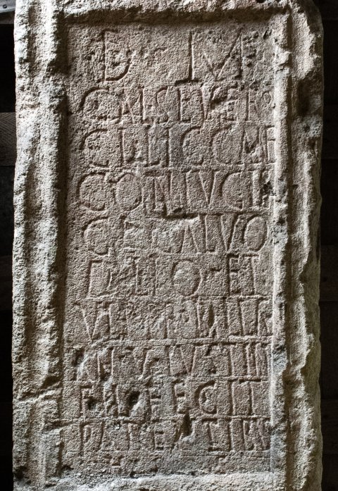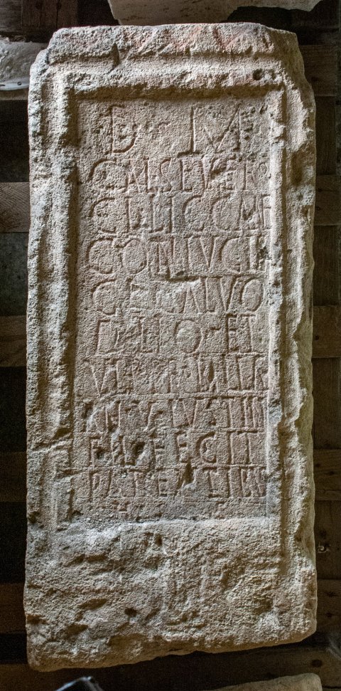 - D(is) M(anibus) / Cal(---) Severo / Cl(audiae) Liccan(a)e / coniugi(bu)s / Cl(audio) Calvo / filio et / Ulp(iae) Proballae / an(norum) V Iustin(us?) / fil(ius) fecit / parentibus / h(ic) s(iti) s(unt)