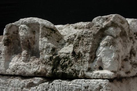 - Dachförmiger Deckel, Eckakrotere mit Masken, in der Mitte des Randes halbrundes Bildfeld mit Brustbild einer Frau mit Kleinkind vor sich.
