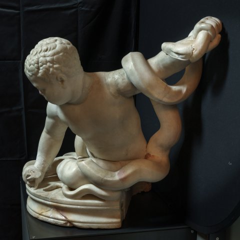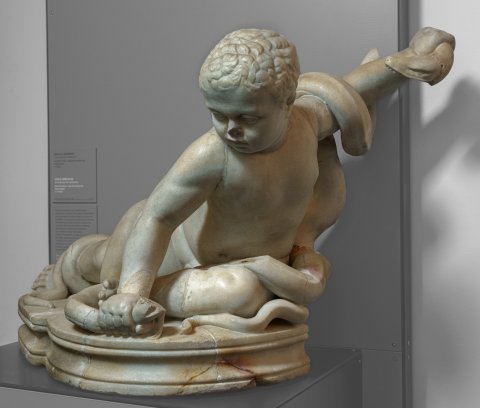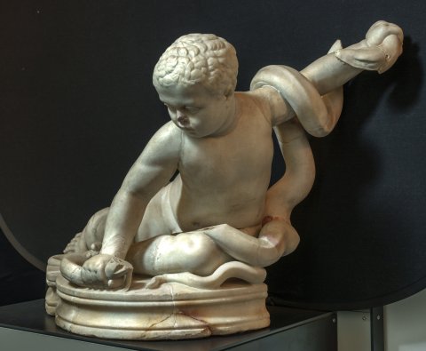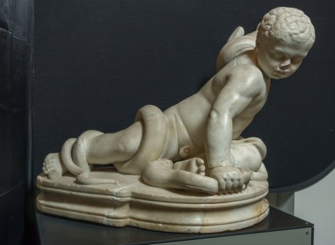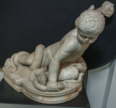 - Mythos: auf dem Boden kauernder Herculesknabe, der mit beiden Händen je eine Schlage erwürgt.
