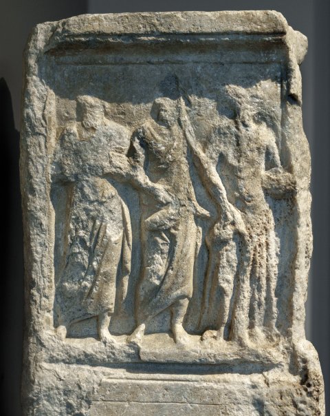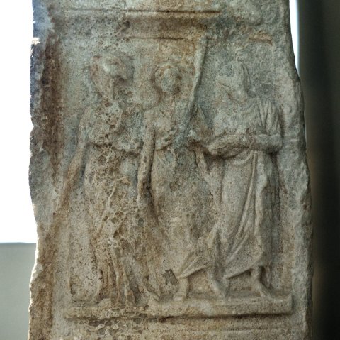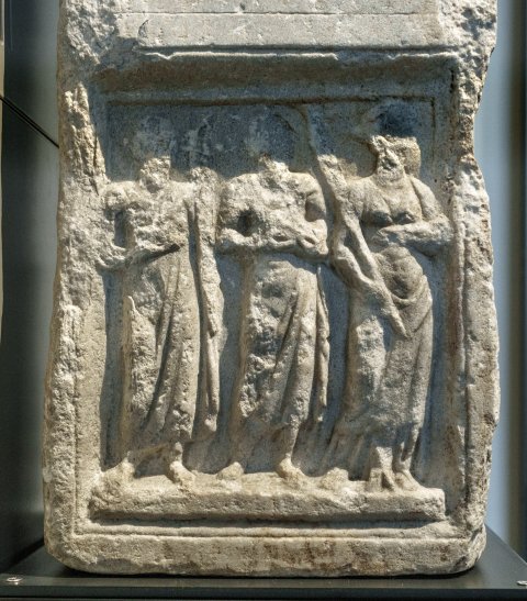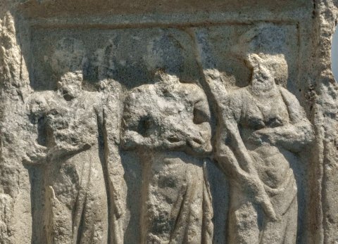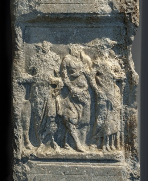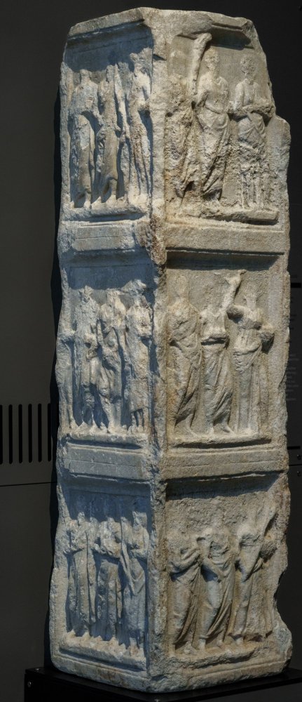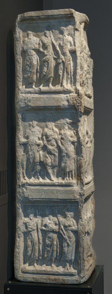 Kleiner viereckiger Pfeiler mit Reliefs auf drei Seiten. Auf jeder Seite je drei Relieffelder mit je drei bekleideten stehenden Personen. Mythische Figuren, Gottheiten, Opfertiere: