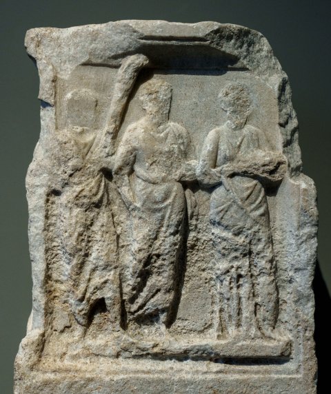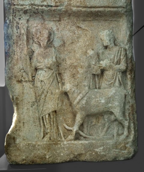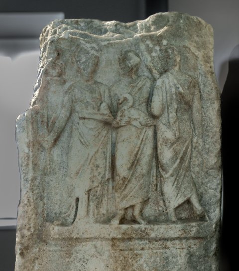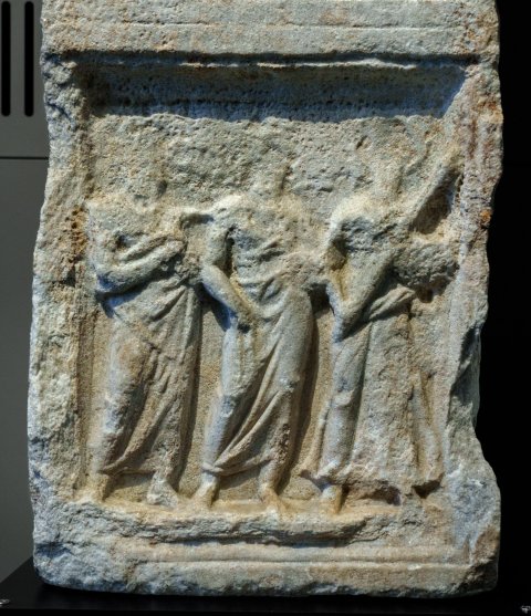 Auf den Reliefs der Vorderseite und der linken Nebenseite stehen links jeweils zwei Männer und rechts eine Frau, tlw. mit Attributen in den Händen (Fackel, Fruchtschale, Kanne, Palmzweig ?). Auf dem mittleren Relief der rechten Nebenseite erscheint zwischen den Männern ein Widder.