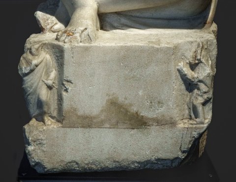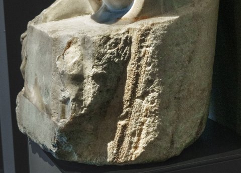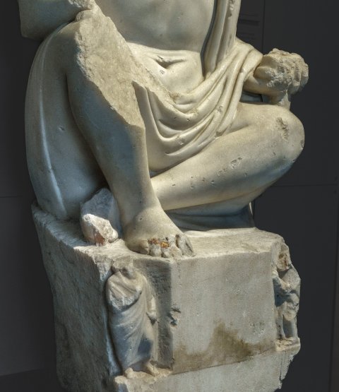 - Kopf, rechte Hand, rechtes Knie abgebr., Basis bestoßen, Rückseite flüchtig ausgearbeitet