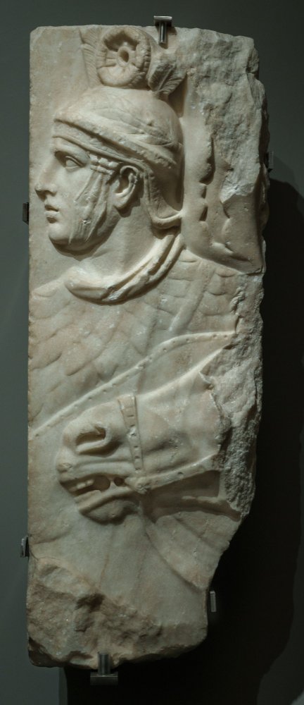 Kopf und Oberkörper eines Soldaten mit Helm, Halstuch, Schuppenpanzer und rautenförmigem Schild. Auf dem Helm Feder; die daneben sichtbare Rosette gehörte zum Akanthusornament über der Schulter des Soldaten. Vor dem Soldaten Rest eines Pferdekopfes mit Zaumzeug.