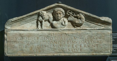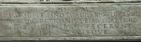 - D(is) M(anibus) / L(ucio) Mussio L(uci) f(ilio) Pino v(ixit) a(nnos) IIII m(enses) X d(ies) XXVIII / L(ucius) Mussius Petronius et Mussia Tyche / filio piissimo fecerunt / sibi suisque