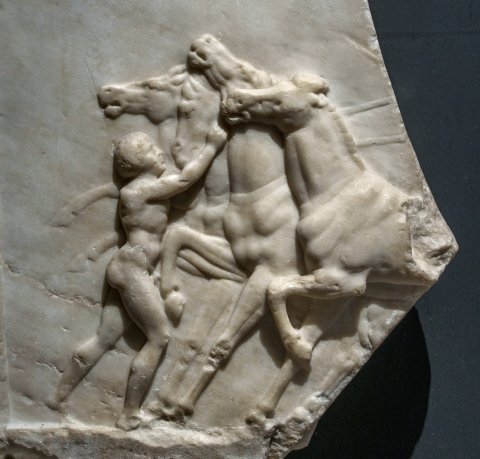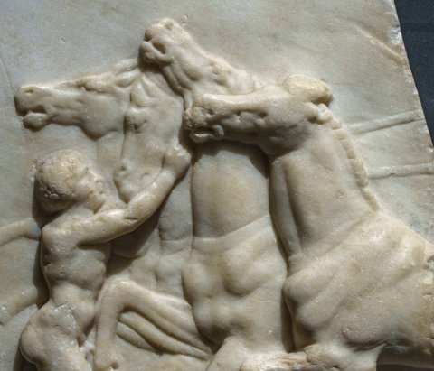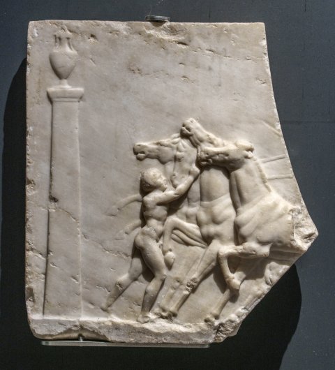 - Wagenrennen: Viergespann in vollem Lauf, das ein nackter Jüngling anzuhalten versucht. Links die Zielsäule, auf der eine Amphore (Siegespreis ?) steht. Votivrelief eines Siegers bei den Panathenäen ?