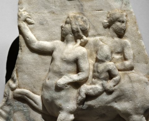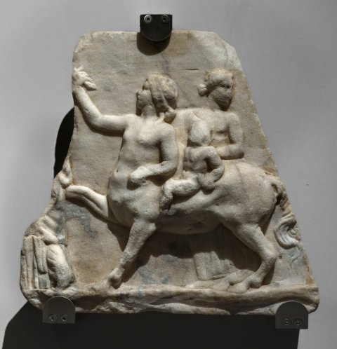 Mythische Figur: nach links ausschreitender jugendlicher Kentaur, der ein nacktes Kind (Knabe) auf seinem Rücken trägt; hinter dem Pferdeleib stehende, nach rechts zurückblickende Fau, weiter links Gewandreste einer weiteren Frau.
