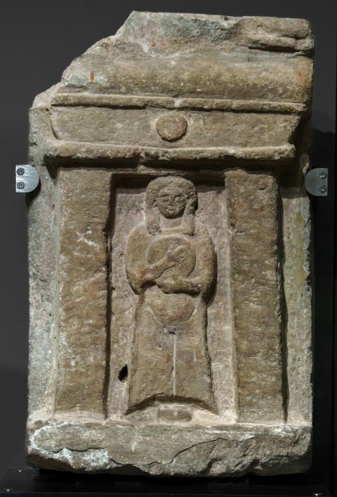 - Stehende bekleidete Frau, runde Scheibe in beiden Händen, in einer rechteckigen Nische zwischen Pilastern, darüber Architrav mit Scheibe und profilierter Abschluss.