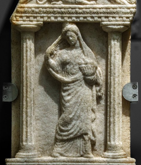 Stehende Frau in Chiton und über den Kopf gezogenem Mantel, in der linken Hand Fruchtkorb. Seitlich kannelierte Säulen, darüber profilierter Architrav mit Zahnschnitt und Eierstab, oben Giebel mit liegendem Panther und Palmettenakroteren.