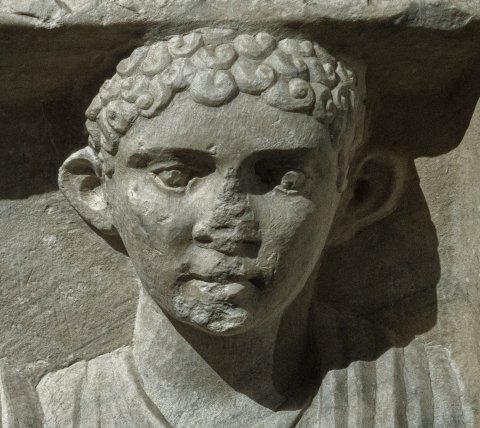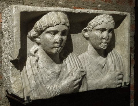 Rechteckige Nische mit Brustbildern einer jungen Frau (Schulterlocken, Armband, Mantel) und eines jungen Mannes (Knabe ?) in Tunica und Mantel. Ehepaar ? Geschwister ?