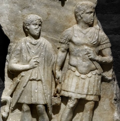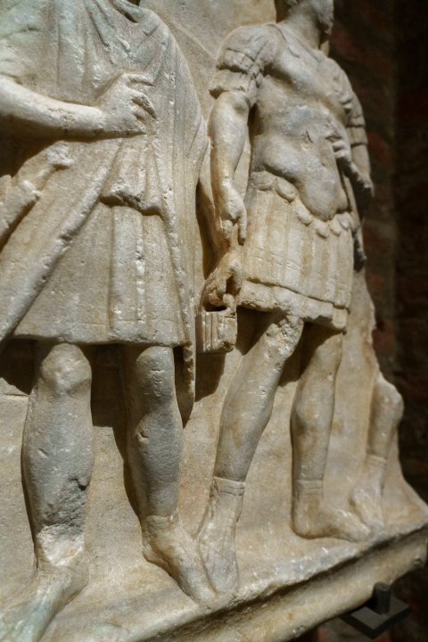 - Nach rechts gewandter, stehender bartloser Offizier in Brustpanzer und hohen Schuhen, in der linken Hand Schwert in Schwertscheide; zu seiner Rechten stehender Librarius - Scriba in Paenula, Polyptychon in der Linken, an der rechten Hüfte Schwert. Von links her kommendes Pferd (nur erhobenes Vorderbei erhalten); rechts weitere Person in kurzem Gewand und Schuhen (Soldat ?). Unten profilierte Standleiste.