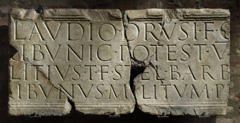 - [Ti(berio) C]laudio Drusi f(ilio) C[aesari Augusto Germanico pont(ifici) max(imo)] / [t]ribunic(ia) potest(ate) V[III imper(atori) XVI consuli IIII p(atri) p(atriae)] / [- G]litius T(iti) f(ilius) Stel(latina) Barb[arus primipilaris praef(ectus) coh(ortis) ---] / [t]ribunus militum p[raef(ectus) fabr(um) Ti(beri) Claudi Caesaris Aug(usti) Germ(anici)]
