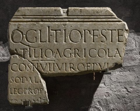 - Q(uinto) Glitio P(ubli) f(ilio) Stel(latina) / Atilio Agricola[e] / co(n)s(uli) II VIIviro epulo[n(um)] / sodali August[al(i) Claud(iali)] / leg(ato) pro pr(aetore) Imp(eratoris) [Nervae Caes(aris)] / Traiani A[ug(usti) Ger(manici) Dacici