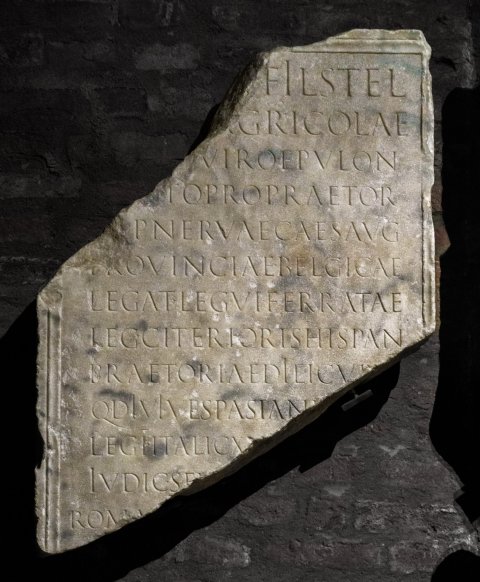 - [Q(uinto) Glitio P(ubli)] fil(io) Stel(latina) / [Atilio] Agricolae / [co(n)s(uli) VII]viro epulon(um) / [lega]to pro praetor(e) / [Im]p(eratoris) Nervae Caes(aris) Aug(usti) / provinciae Belgicae / legat(o) leg(ionis) VI Ferratae / leg(ato) citerioris Hispan(iae) / praetori aedili cur[ul(i)] / q(uaestori) divi Vespasiani [tr(ibuno) mil(itum)] / leg(ionis) I Italic(ae) X[viro stlitib(us)] / iudic(andis) sev[iro turmae --- eq(uitum)] / Roma[norum ---