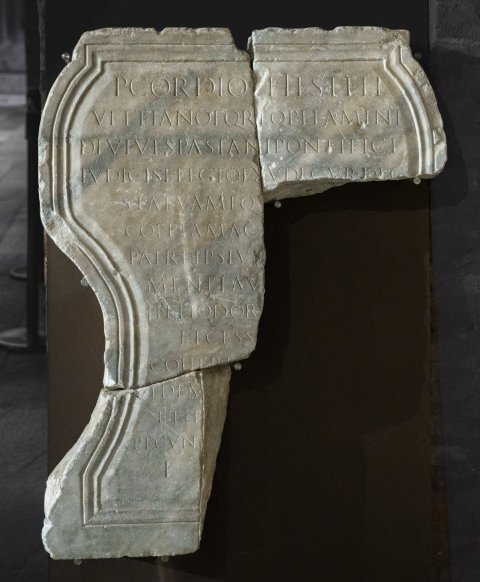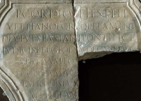 - P(ublio) Cordio [---] fil(io) Stell(atina) / Vettiano eq(uiti) R(omano) eq(uo) p(ublico) flamini / divi Vespasiani pontifici / iudici selecto ex V decur(iis) dec(urioni) / statuam equ[estrem ---] / coeptam a C[---] / patre ipsiu[s ---] / Menelau[s ---] / Heliodor[us ---] / et cess[antibus(?) ---] / cohere[dibus ---] / idem [---] / et h[---] / pecun[ia ---] / l(ocus) [d(atus) d(ecreto) d(ecurionum)]