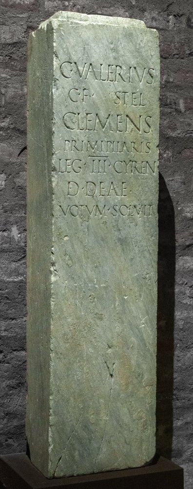 - C(aius) Valerius / C(ai) f(ilius) Stel(latina) / Clemens / primipilaris / leg(ionis) III Cyren(aicae) / D(ianae) deae / votum solvit