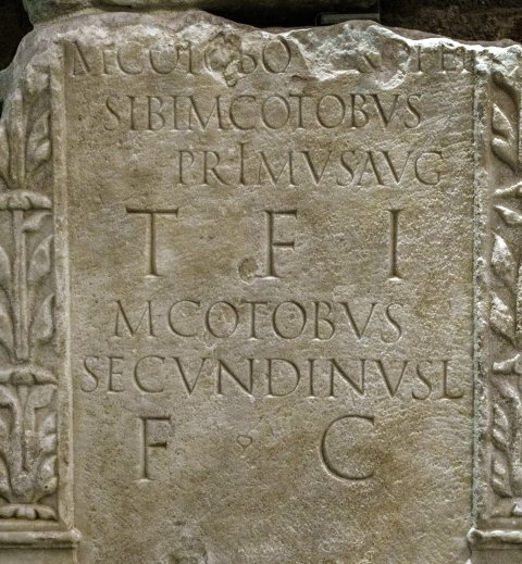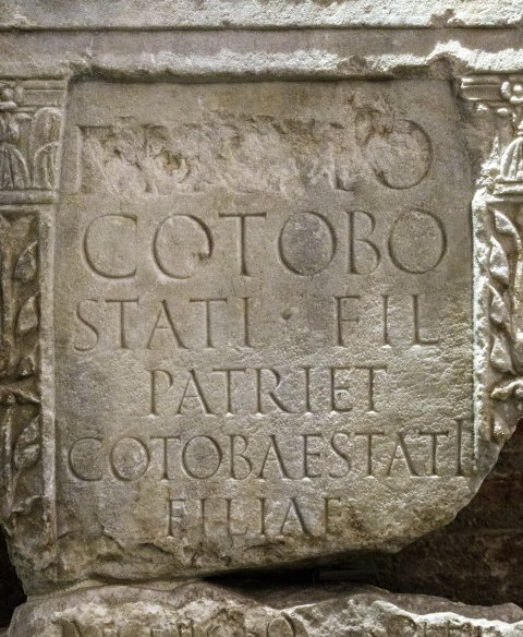- Firmo / Cotobo / Stati fil(io) / patri et / Cotobae Stati / filiae / [------] / M(arco) Cotobo Vero f(ilio) et /sibi M(arcus) Cotobus / Primus Aug(ustalis) / t(estamento) f(ieri) i(ussit) / M(arcus) Cotobus / Secundinus l(ibertus) / f(aciendum) c(uravit)