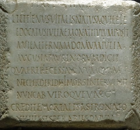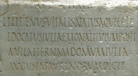 - ---] / {h}ave Vitalis / L(ucius) Tettienus Vitalis natus Aquilei(a)e / edocatus Iulia Emona titulum pos(u)it / ante aeternam domum Iulia / Augusta Taurinorum dicit / quaerere cessavi numquam / nec perdere desii mors intervenit / nunc ab utroque vaco / credite mortales astro nato / nihil est sperabile datum / [------] / terras nec minus et maria / impuri aqu(a)e Padi nec minus et Savi / ira(m) quod optavi mihi tamen pervenit / perpetuam requiem pos(c)o