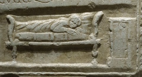 - Unterhalb der Inschrift Kline mit darauf ausgestreckter bekleideter Frau, rechts Kasten.