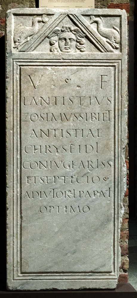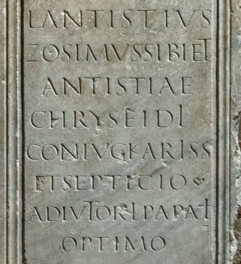 - V(ivus) f(ecit) / L(ucius) Antistius / Zosimus sibi et / Antistiae / Chryseidi / coniug(i) kariss(imae) / et Septicio / Adiutori {pa}pat(r)i / optimo