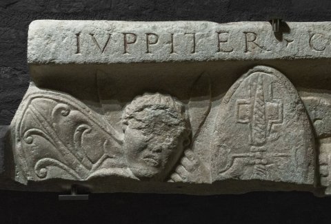 - Tropaion mit Schilden zwischen zwei Gefangenen (der rechte heute verloren), Inschrift auf dem oberen Rahmen.