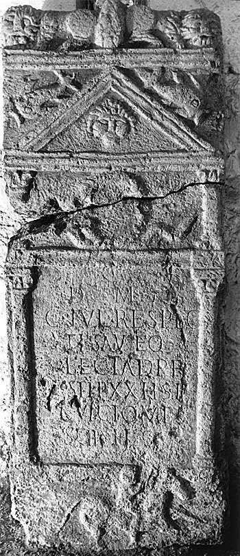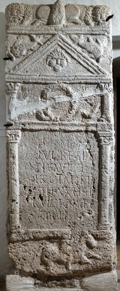 - D(is) M(anibus) / C(aii) Iul(ii) Respec/ti Sav(aria) eq(uitis) / leg(ionis) I ad(iutricis) p(iae) f(idelis) / stip(endiorum) XX h(ic) s(itus) e(st) / C(aius) Victo(rius?) Mes/sor h(eres) s(ecundus)