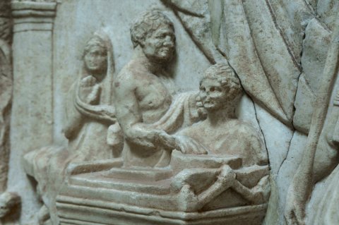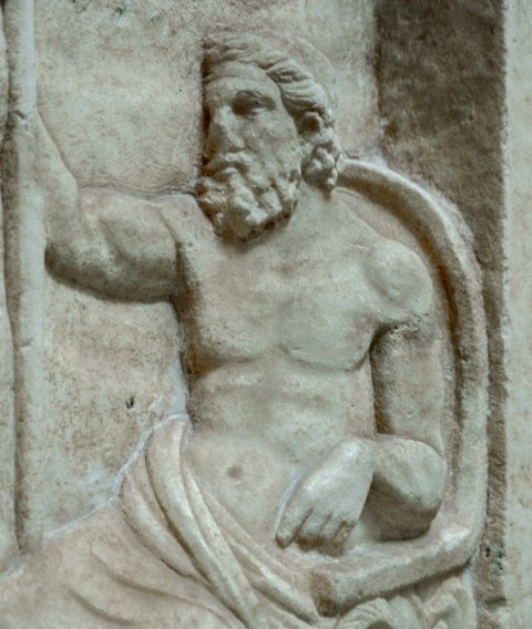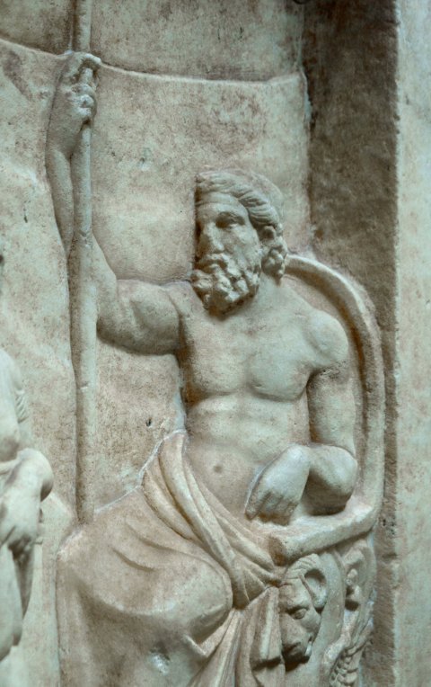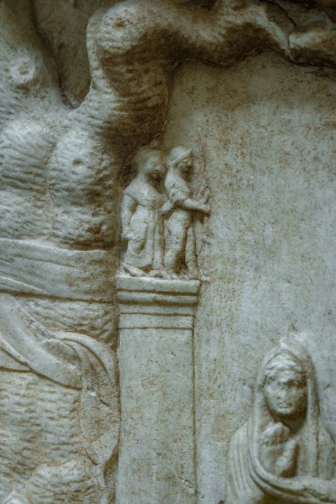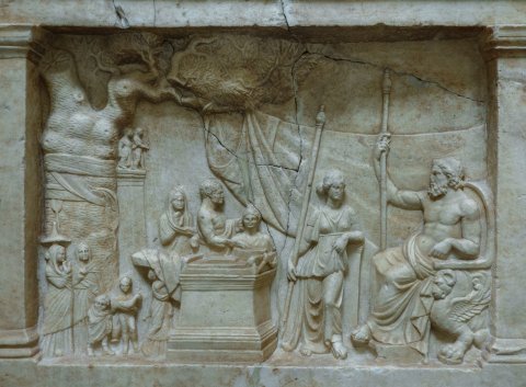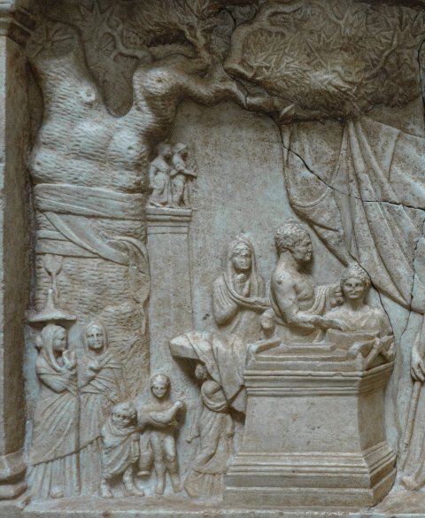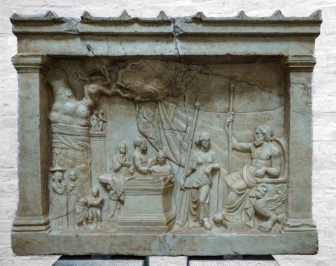 Mythische Figuren: zwischen Pfeilern, die Gebälk und Dach tragen, rechts thronender bärtiger Gott (Asklepios ?) mit Szepter, Armlehne in Form einen Greifen; vor ihm angelehnt stehende Göttin (Hygieia ?) in gegürtetem Chiton, Szepter im rechten Arm. Im Hintergrund Draperie, die an den Ästen eines links stehenden Baumes befestigt ist.