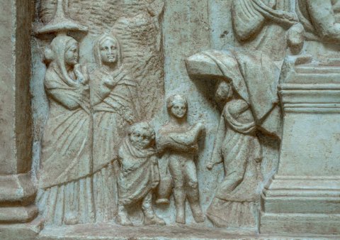 In der Bildmitte großer Altar, dahinter Adoranten, (Ehepaar mit Tochter), weitere Familienmitglieder (drei gabenbringende Kinder, zwei Frauen) nähern sich von links her.