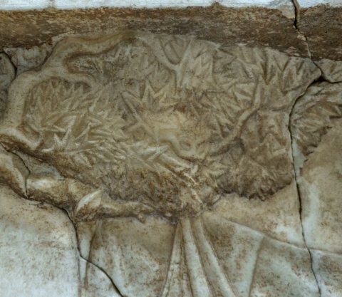 Neben dem mit Tänien umwundenen Stamm des Baumes Pfeiler mit archaistischen Statuetten eines Götterpaares (Apollo und Artemis ?)