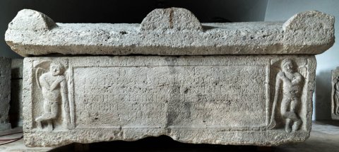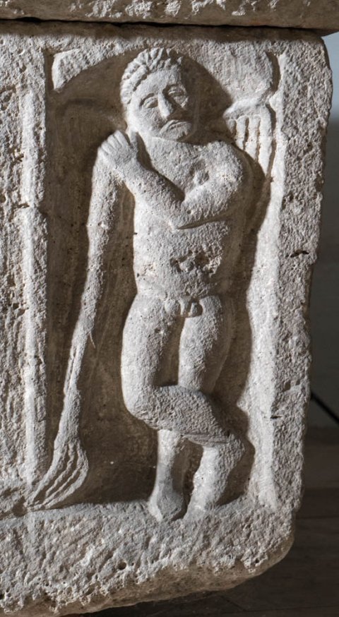 - Eingetieftes Schriftfeld zwischen Bogennischen mit geflügeltem Trauergenius mit gesenkter Fackel.