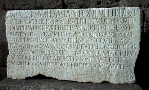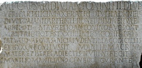 - Imp(eratori) Caesari divi Antonini fil(io) divi / Veri Parthici max(imi) fratri divi Hadr(iani) nep(oti) / divi Traiani Parthici pronep(oti) divi Nervae / abnepoti M(arco) Aurelio Antonino Aug(usto) pont(ifici) / max(imo) trib(unicia) potest(ate) XXIIII imp(eratori) V co(n)s(uli) III p(atri) p(atriae) / statuas duas quas Anicia Pudentilla codicillis / ex HS XXX(milibus) n(ummum) poni iussit Manlia Macrina / mater et heres adiectis HS VIII(milibus) n(ummum) fecit / C(aio) Manilio Maniliano genero curante