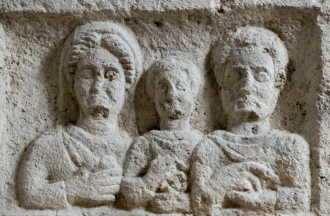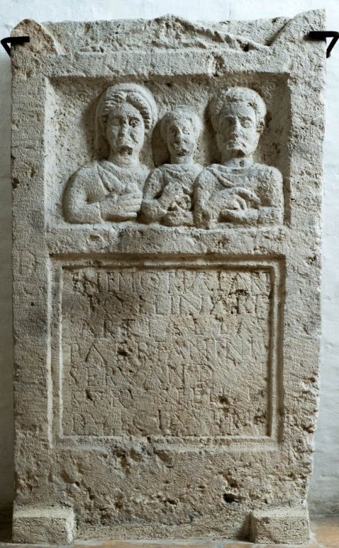 Im Hauptbild Familie: in Rechtecknische Brustbilder eines Ehepaares mit Kind. Links Frau: Schleier, Mittelscheitel, Ärmelgewand, in der Rechten Apfel. In der Mitte Knabe: Ärmeltunica, Sagum, in den Händen Vogel(?). Rechts Mann: bärtig, Locken, Ärmeltunica, Sagum, Scheibenfibel. - Inschrift