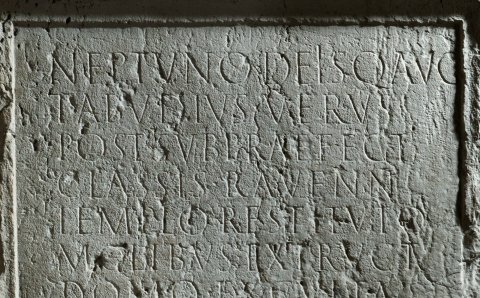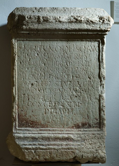 - Neptuno deisq(ue) Aug(ustis) / T(itus) Abudius Verus / post subpraefect(uram) / classis Ravenn(atis) / templo restituto / molibus extruct(is) / domo exculta / in area d(ecreto) d(ecurionum) / concessa sibi / dicavit