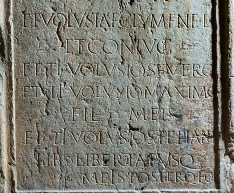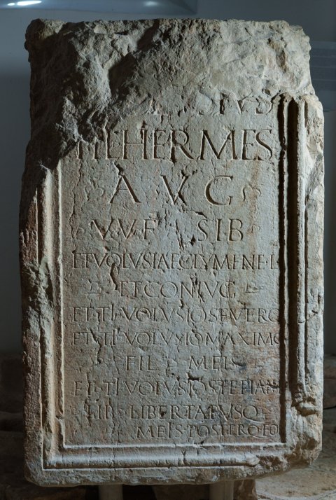 - [Ti(berius) V]olusius / Ti(beri) l(ibertus) Hermes / Aug(ustalis) / v(i)v(us!) f(ecit) sib(i) / et Volusiae Clymene l(ibertae) / et coniugi / et Ti(berio) Volusio Severo / et Ti(berio) Volusio Maximo / fil(iis) meis / et Ti(berio) Volusio Stephano l(iberto) / lib(ertis) libertab(us)q(ue) / meis poster(is)q(ue) eor(um)