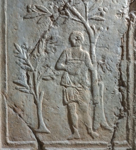 - Auf den Nebenseiten links Mann mit Korb und Winzermesser (Diener) zwischen Weinstöcken; rechts Diener zwischen Olivenbäumen.