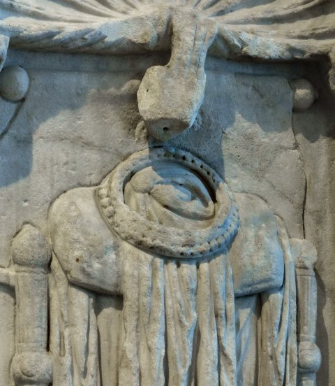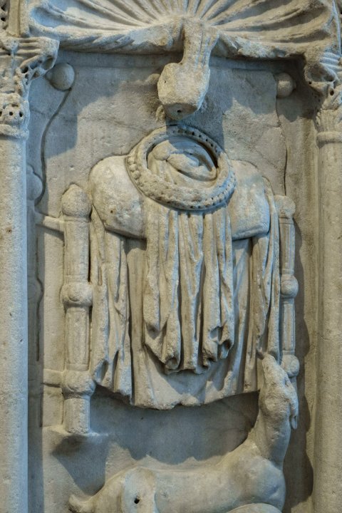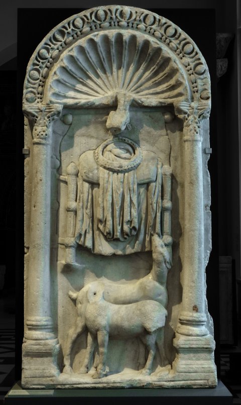 Relief mit Bogenabschluss. Muschelbaldachin, gerahmt von Kyma mit Perl- und Eierstab, getragen von glatten Säulen. Im Bildfeld Thron mit Polster und Draperie, darauf Chlamys mit Scheibenfibel und Kranz. Von oben herabfliegende Taube (Kopf und Flügel waren angesetzt). Unterhalb des Throns zwei Rehe mit erhobenen Köpfen. - Kommentar